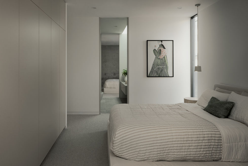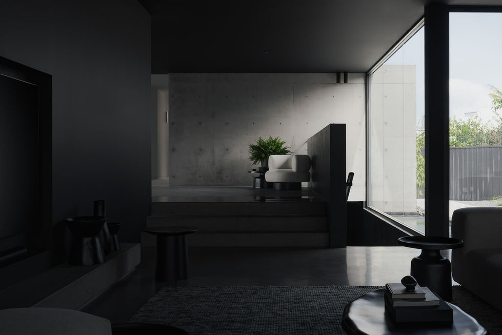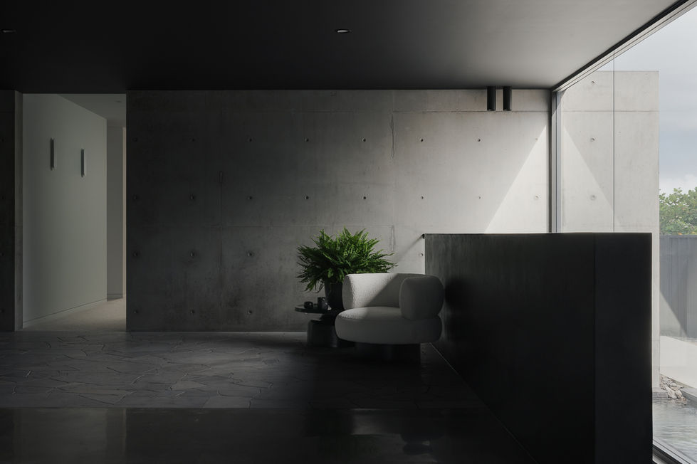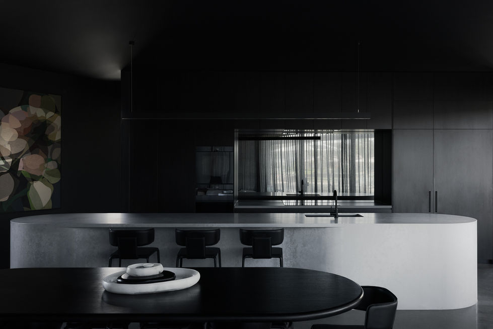 Internally, the planning is divided into two distinct experiences. The eastern side is intentionally moody and intimate, housing the master suite, main living, kitchen and dining spaces within a darker, more atmospheric palette. In contrast, the western wing adopts a lighter, warmer character for the secondary bedrooms and study, creating a subtle rhythm between retreat and openness throughout the home.